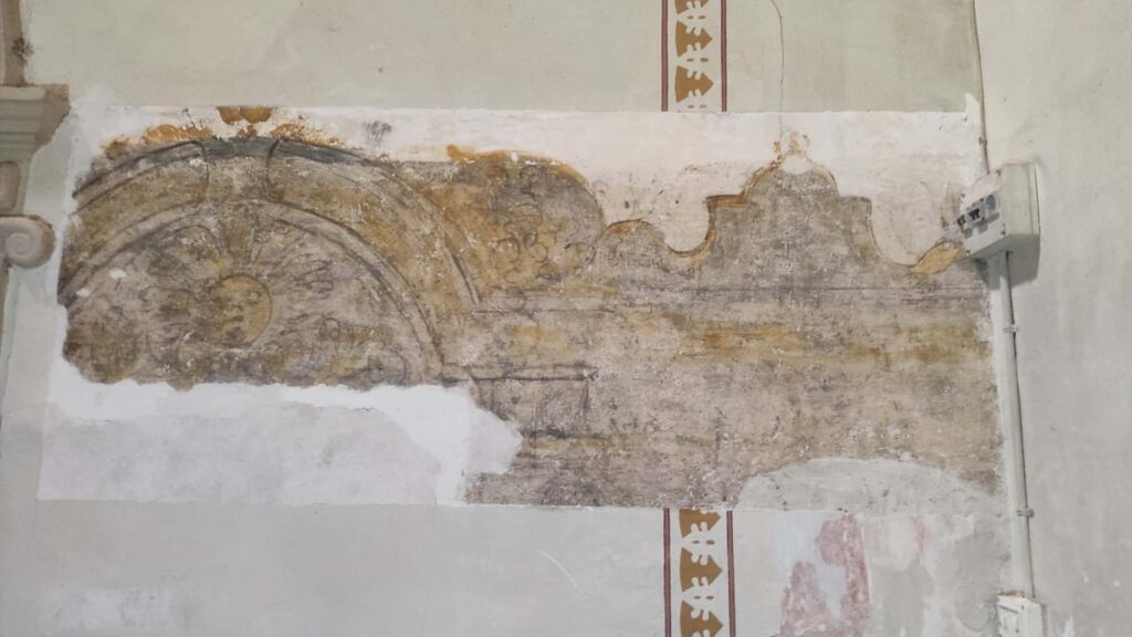 Es desplega als murs laterals de la capella i mostra una seqüència d’elements arquitectònics amb motius florals i volutes. Complementa el conjunt barroc que integra les pintures de la part alta, la volta i el frontis exterior, datades al s. XVII-XVIII. S’han fet prospeccions per conèixer l’abast espacial i l’estat de conservació.